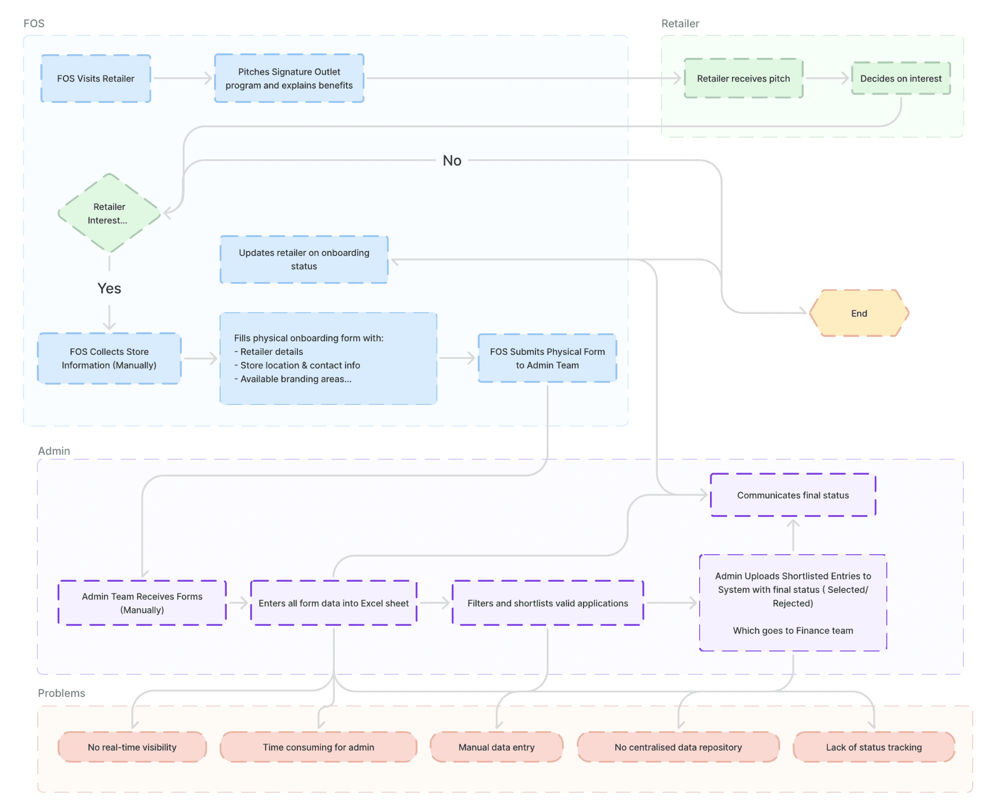 The existing onboarding ecosystem for Signature Retailers operated through a highly manual and fragmented process, relying on physical booklets and paper-based forms. This required Field Officers (FOS) to collect data manually and the admin team to later digitize and verify it — leading to significant operational inefficiencies.