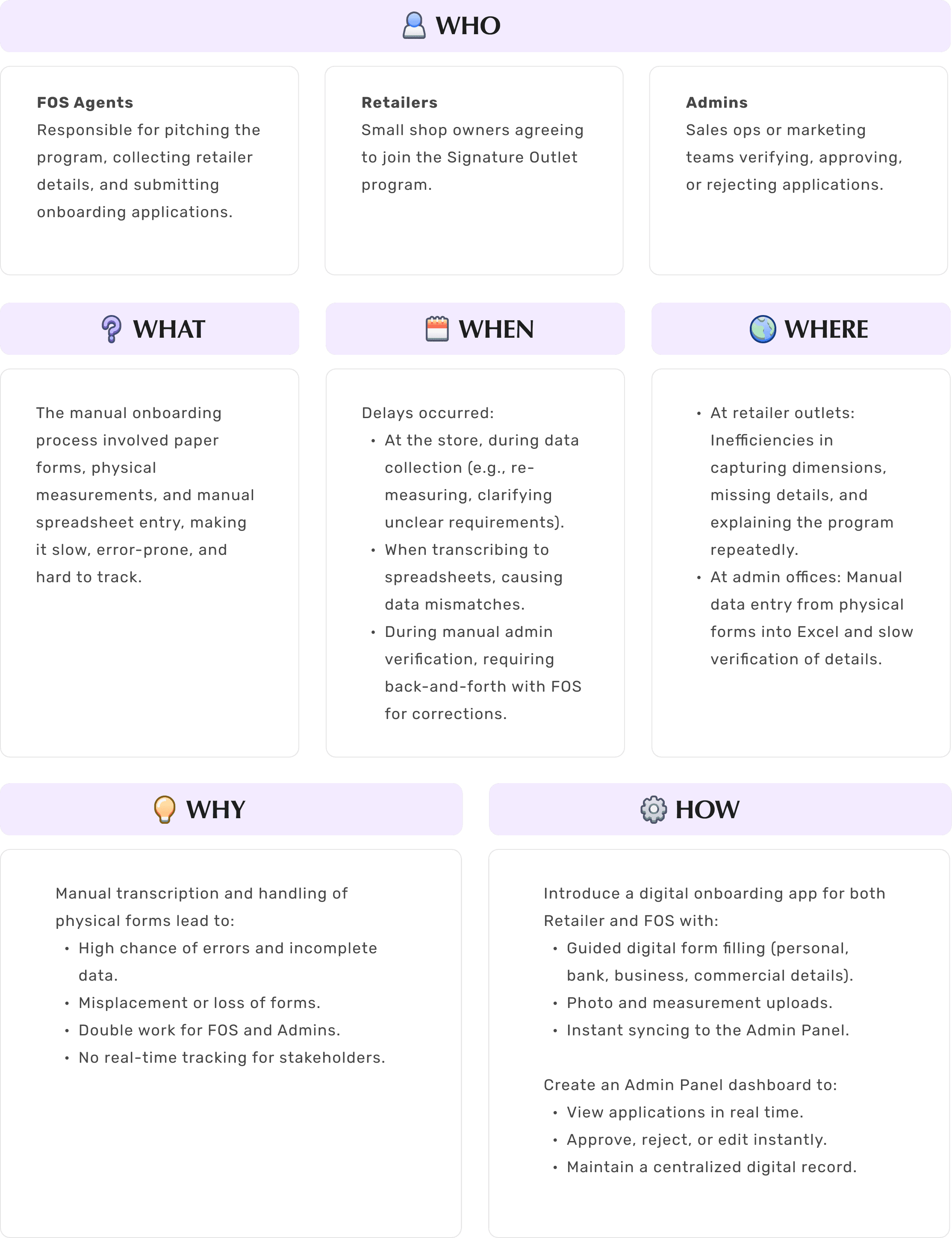 Design a digital onboarding platform for Signature Outlets that minimizes manual effort, improves data accuracy, and empowers Admins, FOS, and Retailers with real-time visibility and control.